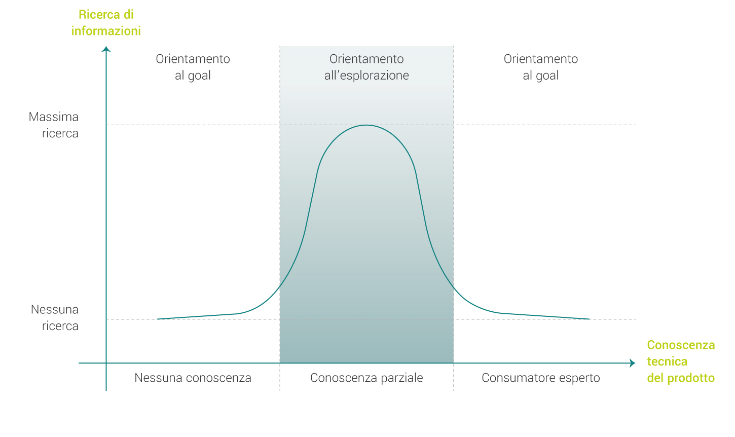 Ad approfondire le specificità del prodotto sarà molto più probabilmente il consumatore con conoscenze nella media, abbastanza informato da percepire il rischio d’acquisto, ma non abbastanza da scegliere a colpo sicuro.