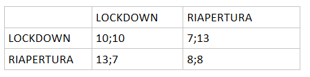 Per la Germania la situazione sarebbe simmetrica. Entrambi i Paesi, immaginando che siano logici nelle loro scelte, e non sapendo le decisioni degli altri Paesi, finiranno prima o poi con riaprire le economie a scapito del pieno recupero sulla salute, ritrovandosi in situazioni per entrambi non ottimali (ricadendo quindi nell’Equilibrio di Nash).
