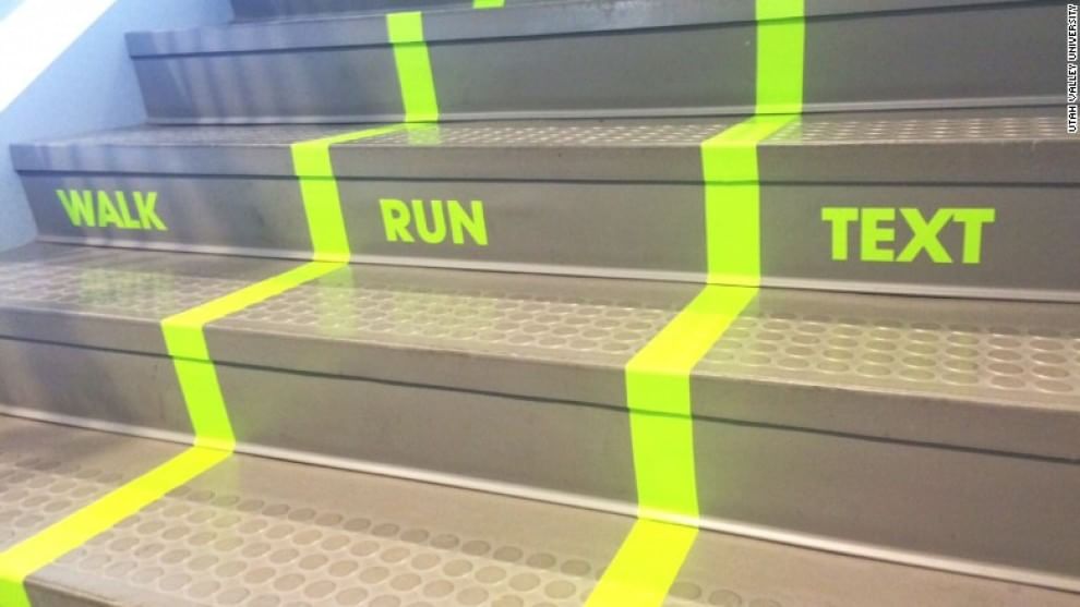 Un altro esempio di come il nudging viene impiegato per smistare le folle, in questo caso nella Valley University di Utah. Dobbiamo negare che la gente cammina con il telefono in mano? Possiamo proibirlo? No, ma possiamo fare una corsia apposta! E chi ha fretta, si può accomodare nella corsia centrale.